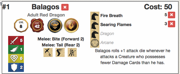 balagos-startEshaedra, the blue, is a bit smaller. She has an attack of 4, a health of 5, and 2 armor. She costs 39 Legion Points, giving us bit more room that Balagos had. Again, we’ll want a breath weapon. In Eshaedra’s case, we’ll be equipping Lightning Breath. Her Primary Weapon Value of 4 makes Lightning Breath cost 4 Legion Points.