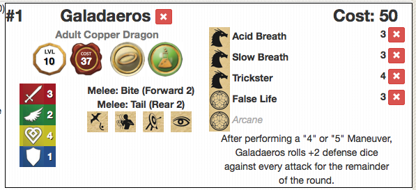 Galadaeros won’t want to let the other two dragons get too close, so slowing them down with Slow Breath, which also takes away a defense die, is a good choice and costs another 3 Legion Points.