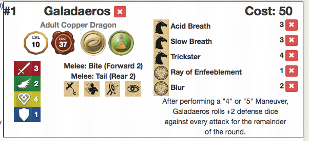 Galadaeros’ lower stats means he only costs 37 Legion Points. He will still want his breath weapon, as it can penetrate the two Armor that both Eshaedra and Balagos have. His breath is an Acid Breath and it costs 3 Legion Points.